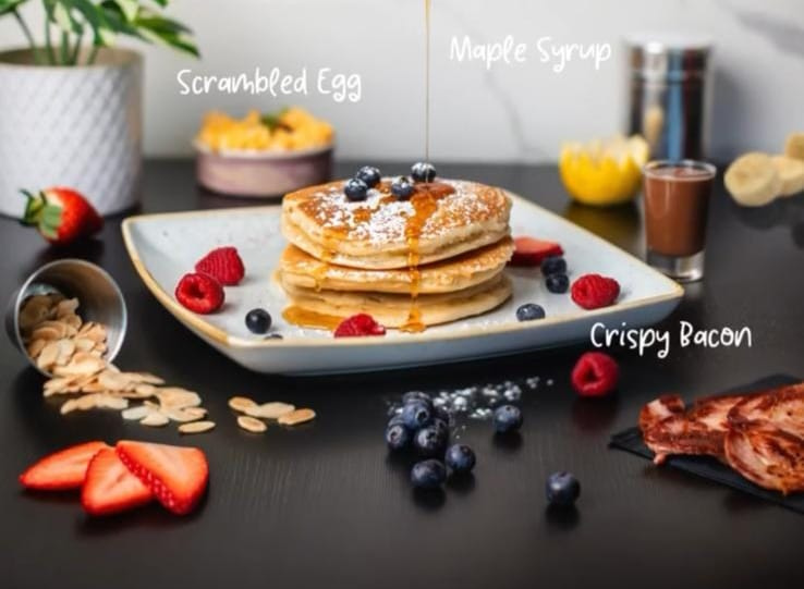 Bacon, hash browns, egg, Cumberland sausage, and pancakes with berries/syrup.