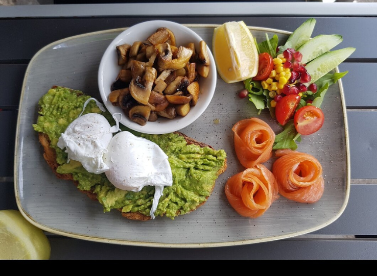 Two poached eggs on sourdough, smashed avocado, and choice of smoked salmon or bacon.